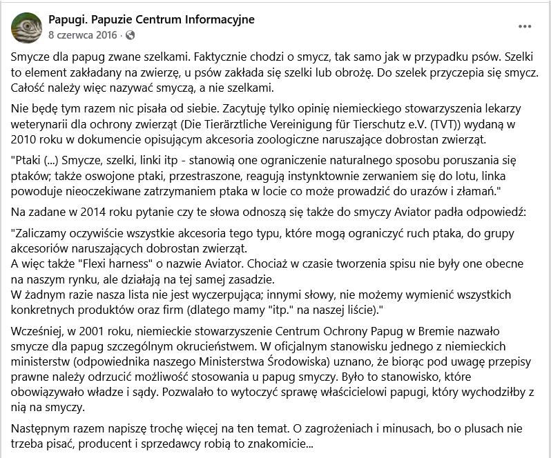 Ale spróbujcie spytać o konkrety. Oczywiście teraz nie podadzą, ale przedstawią wkrótce. Tak jak np. obietnica podania źródła wyliczeń dotyczących dopuszczalnego ciężaru szelek, która pojawiła się na krótko w komentarzu na kanale Papuziej Telewizji pod filmem „Szelki to nie plecak”. PCI też obiecywało w swoim artykule, że „następnym razem napisze trochę więcej na ten temat”, ale chyba już nie napisze, bo niemieccy weterynarze już dawno poddali się i zmienili zdanie o szelkach. W 2018 roku opublikowali nowy dokument „Stellungnahme zu dem Fluggeschirr Aviator für Psittaziden”*. Stwierdzili w nim, że: „ptakom w szelkach można zapewnić więcej możliwości lotu” niż w domu , i że mogą one służyć jako „metoda treningowa do swobodnych lotów”. W związku z tym „stosowanie ich w wymienionych warunkach może być zgodne z dobrostanem zwierząt.” Trochę tych warunków wymienili, m.in. np. „Używanie długiej linki (> 3 m) jest możliwe tylko w miejscach wolnych od drzew i masztów, aby uniknąć zaplątania” lub „Opiekun musi posiadać odpowiednią wiedzę na temat zachowań kotów”. Ale najważniejsze, że nagle okazało się, że szelki już nie „ograniczają naturalnego sposobu poruszania się ptaków”, a wręcz przeciwnie – dostarczają więcej możliwości naturalnego poruszania się. Szkoda tylko, że zrozumienie tego zajęło im kilka lat, a w międzyczasie na tej fali popłynęło np. PCI wmawiając nam, że szelki to „szczególne okrucieństwo”.