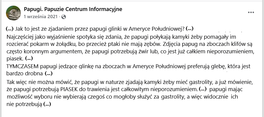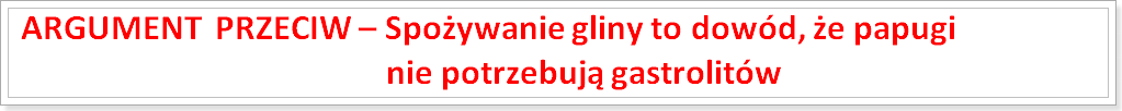 Jednak na Papuzim Centrum Informacyjnym poznacie nowe teorie, będące nadinterpretacją, że zjadanie tej glinki jest dowodem na to, że papugi „w Ameryce Południowej preferują glebę” niż żwirki. A więc przyznaje się, że zjadają „glebę”, choć jednocześnie zaprzecza się przydatności piasku w trawieniu. I konkluduje się, że skoro papugi zjadają tę „glebę„, która nie jest gastrolitem, jak żwirek, to „widocznie gastrolitów nie potrzebują”. Do niezrozumienia roli gastrolitów w trawieniu pokarmów roślinnych, dochodzi tu jeszcze niezrozumienie tego, co może być gastrolitem. I skąd pewność, że te papugi z peruwiańskich klifów nie wyszukują też dodatkowo większych żwirków w innych miejscach?