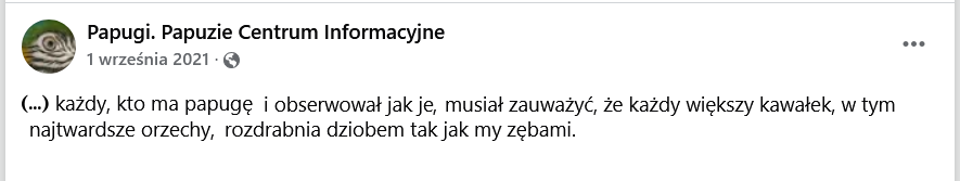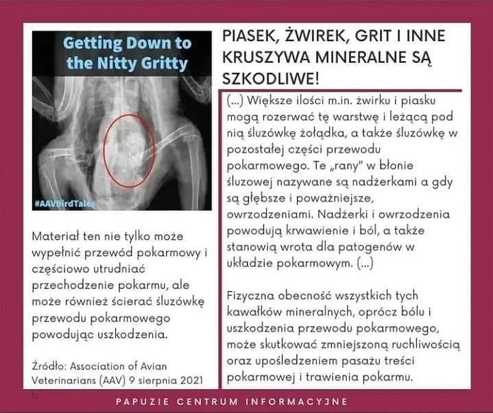 Jak więc Państwo widzicie, w polskiej przestrzeni publicznej są osoby, które nie bacząc na twarde argumenty za, wciąż głoszą te wątpliwe przeciw żwirkom, a nawet swoje teorie „twórczo rozwijają”, jak w przedstawionym opisie przypadku amazonki, która objadła się betonową żerdzią. „Wmówiły” sztucznej inteligencji, że żwirki są szkodliwe, i przekonały o tym niektóre polskie grupy fejsbukowe, w których spotkacie się z opiniami, że grity nadają się wyłącznie dla gołębi, a papugom szkodzą i nie wolno ich stosować. Tymczasem głoszone przez Papuzie Centrum Informacyjne przekazy – nie tylko te o gritach, ale też np. o okrucieństwie szelek dla papug, o papuzich telomerach czy o ręcznym karmieniu i stereotypiach – noszą cechy świadomej manipulacji, której celem jest stworzenie „dowodów” mających potwierdzić bardzo konserwatywne poglądy autorki.