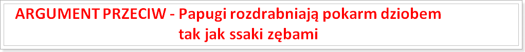 Mam nadzieję, że Państwo jesteście jednak lepszymi obserwatorami. Ssaki spożywające pokarm roślinny, również my ludzie, mają w swoim uzębieniu siekacze służące do rozdzielania (rozdrabniania) jedzenia i zęby trzonowe, które rozcierają go celem uwolnienia składników pokarmowych chronionych ścianami komórkowymi. Jedynie zęby trzonowe są w stanie w większym stopniu zdegradować te ściany zbudowane z nierozpuszczalnych celuloz i lignin. I, o ile moglibyśmy nawet porównać papuzi dziób do siekaczy, to przypisywanie mu roli zębów trzonowych, jest absolutnie nieuprawnione.