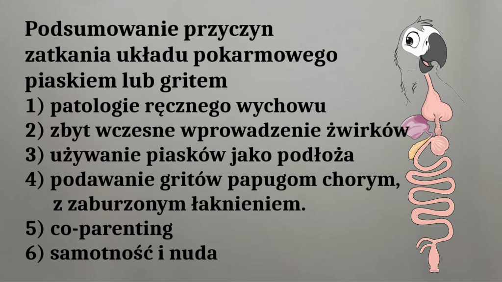 Udokumentowane, głównie w USA, przypadki patologicznego spożywania gritów dotyczyły właśnie papug młodych, które były w końcowym etapie sztucznego karmienia, i które nie otrzymały na czas kolejnej dawki pokarmu. Poszukując go, znajdowały naczynie ze żwirkiem i pochłaniały go, chcąc instynktownie zaspokoić głód. A dlaczego takie doniesienia pochodzą głównie z USA? Bo to właśnie w USA po raz pierwszy zastosowano ręczny wychów papug, więc USA mają najdłuższą historię sztucznego karmienia, tam wykarmia się najwięcej papug i dlatego tam zdarzyło się najwięcej takich przypadków.
